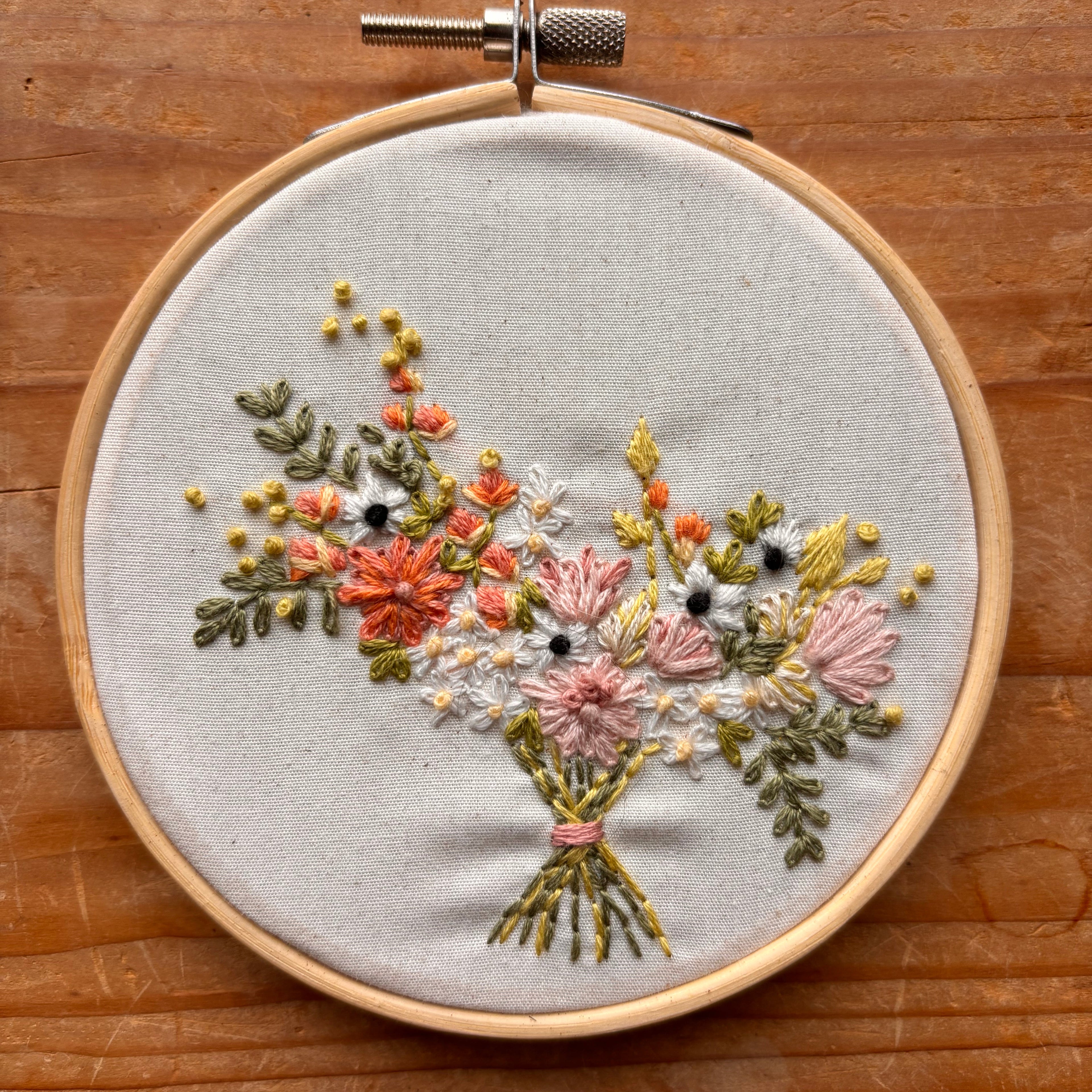 Each piece is hand-embroidered by Adrienne, stitch by stitch. The process takes 4–8 weeks depending on bouquet complexity and current orders.