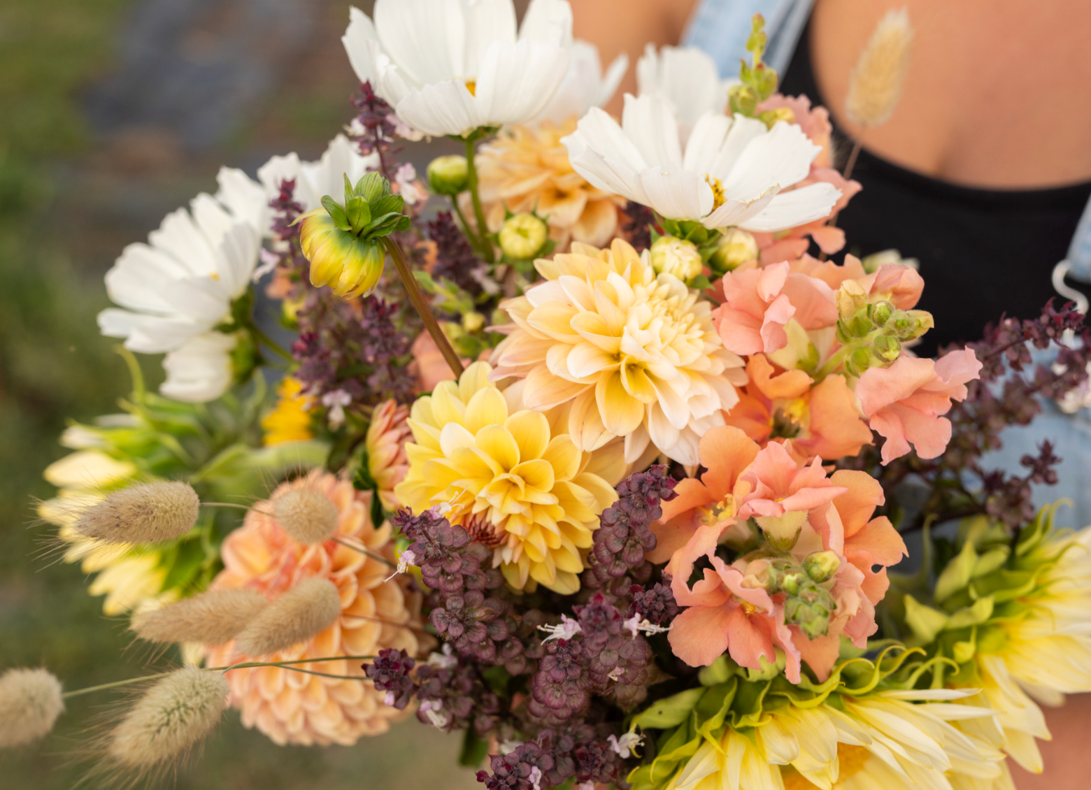 Our 4-week dahlia subscription will BLOW YOUR MIND. These stunning flowers steal the show every summer. With our hoop house up and running, the dahlias are more abundant than ever. The bouquets will feature dahlias (obv) but will be filled with other fall-blooming beauties and foliage. BIG bouquets.
